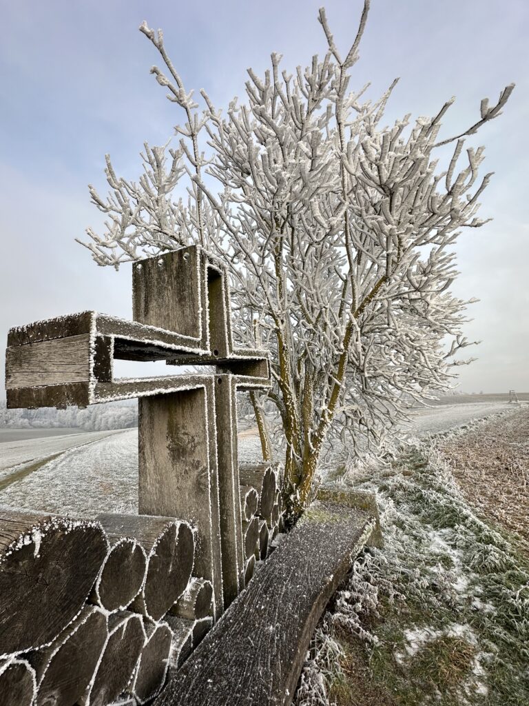 Der Künstler der Objektbank, Willi Leo Hengge, rückt bei seiner Erklärung zum Kunstwerk die Nägel in den Mittelpunkt, die die Wundmale verursachen. Das Kreuz ist wie ein Rahmen gearbeitet. Die Nägel sind darin verborgen, aber doch offensichtlich.