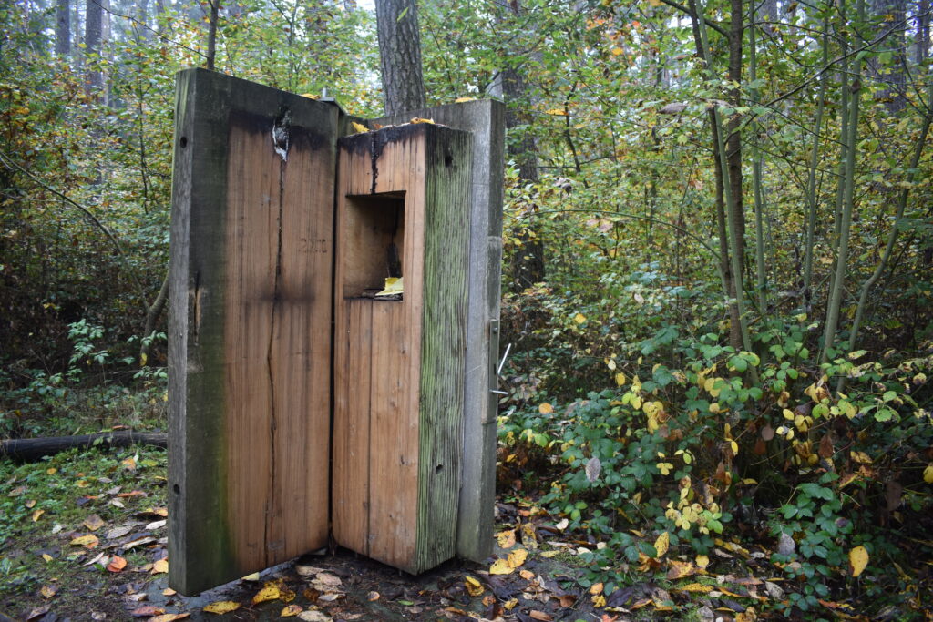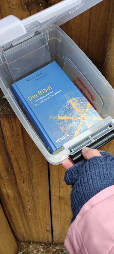 Ein Schrank mitten im Wald? Was ist denn das? Kurz nach dem Lazarus-Grenzstein trifft der Wanderer auf ein weiteres Holzkunstwerk von Willi Leo Hengge. Es gilt eine Tür zu öffnen und im Inneren ein Evangelium zu entdecken. Der Künstler wollte mit seiner Gestaltung des Objekts ausdrücken, dass das Evangelium ähnlich einer Tür als Eingang zu verstehen ist. Für Franziskus wurde die Bibel zum wichtigsten Begleiter in seinem Leben, deren Botschaft er weitergab. Das Evangelium ist aktuell in einer Kunststoff-Box verschlossen im Schrank zu finden, um sie vor der Witterung zu schützen. Die Wanderer sind eingeladen, in dem Buch zu blättern.
