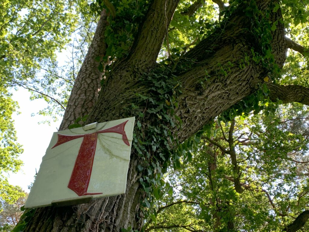 Das Glasobjekt „Tau-Zeichen“ von Roland Frank steht laut dem Künstler für ein urchristliches Zeichen der Vollkommenheit und Ganzheit mit Christus. Er wählte für das T die Farbe Rot, als Ausdruck der Leidenschaft im Glauben an Christus. Es soll aber auch an das Leiden Christi erinnern. Der weiße Hintergrund symbolisiert die Reinheit zu Gott.