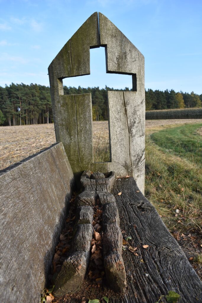 Von Schwaighausen führt der Weg den Hügel hinauf zur Objektbank von Willi Leo Hengge „Nackt dem nackten Christus folgen“. Das Holzkunstwerk verdeutlicht die Ablösung vom reichen Elternhaus, die Franziskus vollzieht. Der Vater will seinen Sohn wieder in seine Obhut holen und sieht ihn als seinen Nachfolger als Tuchhändler. Dazu will er ihn sogar per Richterspruch zwingen. Doch Franziskus befreit sich aus seiner alten Vaterbeziehung, legt seine alten Kleider ab und damit seine frühere Lebensweise. Er will auf das väterliche Erbe verzichten und sich ganz seinem Leben mit Gott widmen. Von jetzt an fühlt er sich nur noch verpflichtet, die Botschaft von Jesus Christus in die Welt zu tragen.
